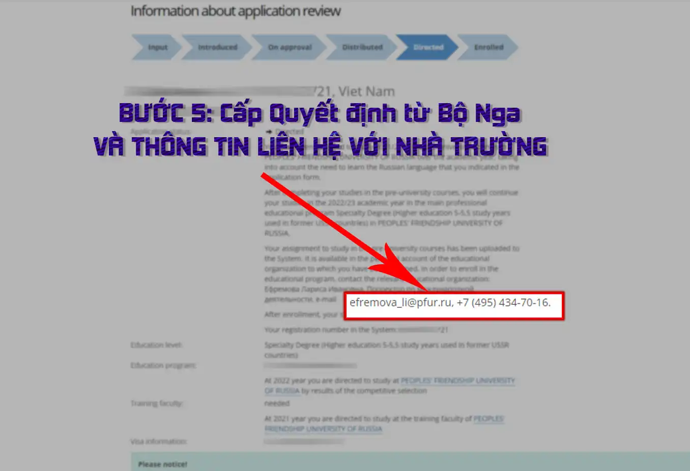 Một cải tiến rất có ích và hỗ trợ tốt cho các bạn từ trang Russia-edu.ru của Bộ Khoa học và Giáo Dục Đại học Liên bang Nga. Với tất cả các bạn trúng tuyển học bổng năm 2021 này, nếu hồ sơ đã chuyển trạng thái sang bước 5, có thể hiểu là bước Bộ Nga đã duyệt và gửi Quyết định (hay còn gọi là thư giới thiệu) xuống Trường bạn học Dự Bị thì trên phần tra cứu của bước này đã có Thông tin hướng dẫn cũng như địa chỉ Email + số điện thoại liên lạc của người phụ trách việc nhập học của bạn tại Trường này.