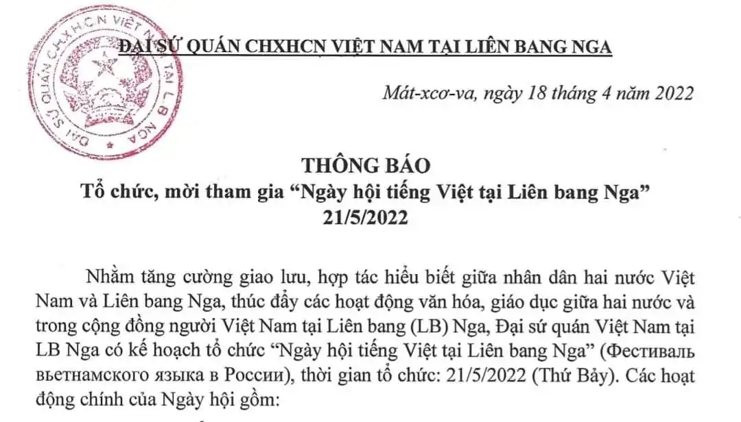Nhằm tăng cường giao lưu, hợp tác hiểu biết giữa nhân dân hai nước Việt Nam và Liên bang Nga, thúc đây các hoạt động văn hóa, giáo dục giữa hai nước và trong cộng đồng người Việt Nam tại Liên bang (LB) Nga, Đại sứ quán Việt Nam tại LB Nga có kế hoạch tổ chức “Ngày hội tiếng Việt tại Liên bang Nga” (Фестиваль вьетнамского языка в России, thời gian tô chức: 21/5/2022 (Thứ Bảy). Các hoạt động chính của Ngày hội gồm: