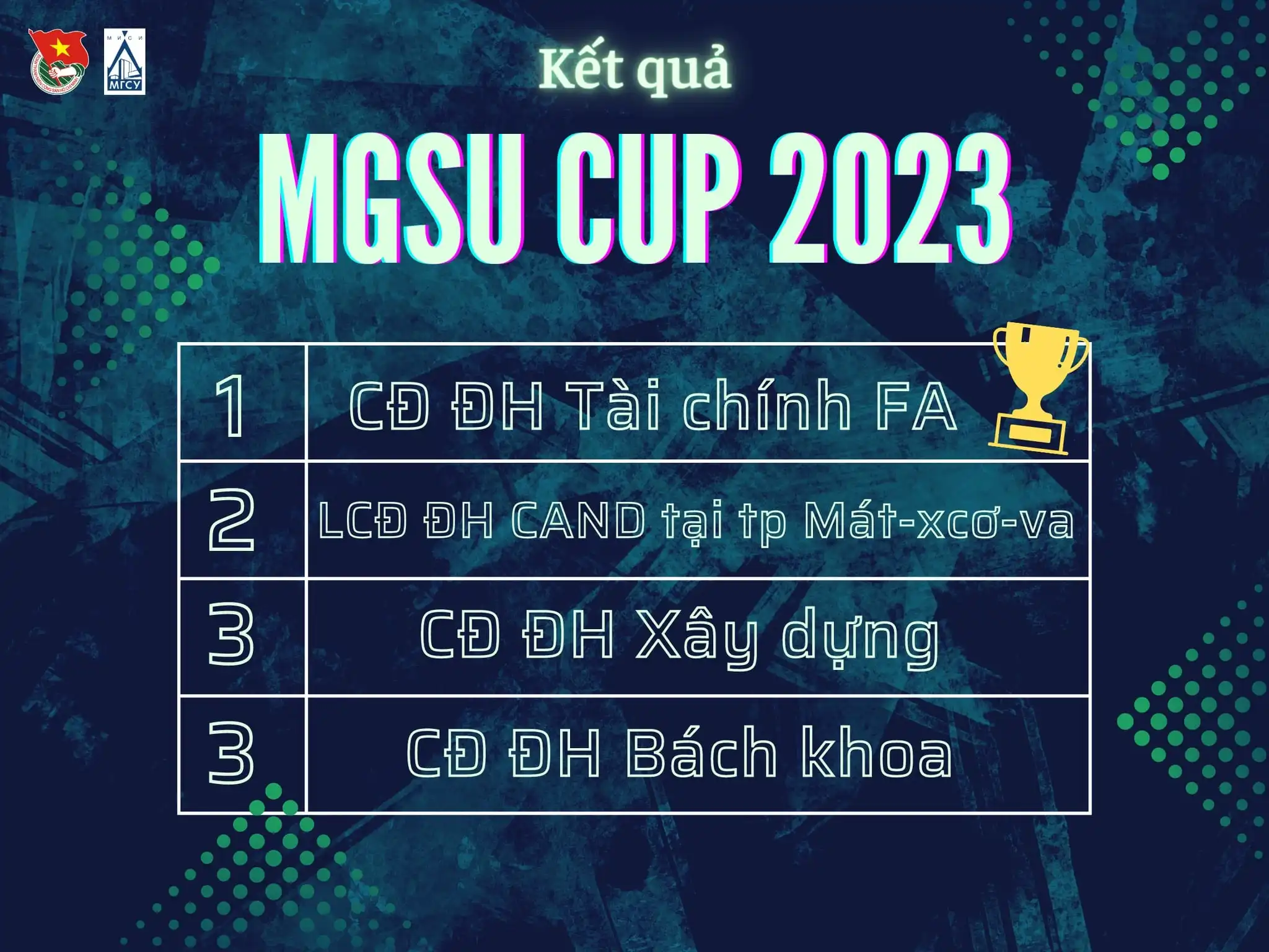 Vào hồi 17h15p Chủ nhật ngày 05 tháng 03 năm 2023, giải bóng đá nam cup Tứ hùng MGSU CUP 2023 đã chính thức khép lại. BTC xin công bố kết quả giải bóng như sau: