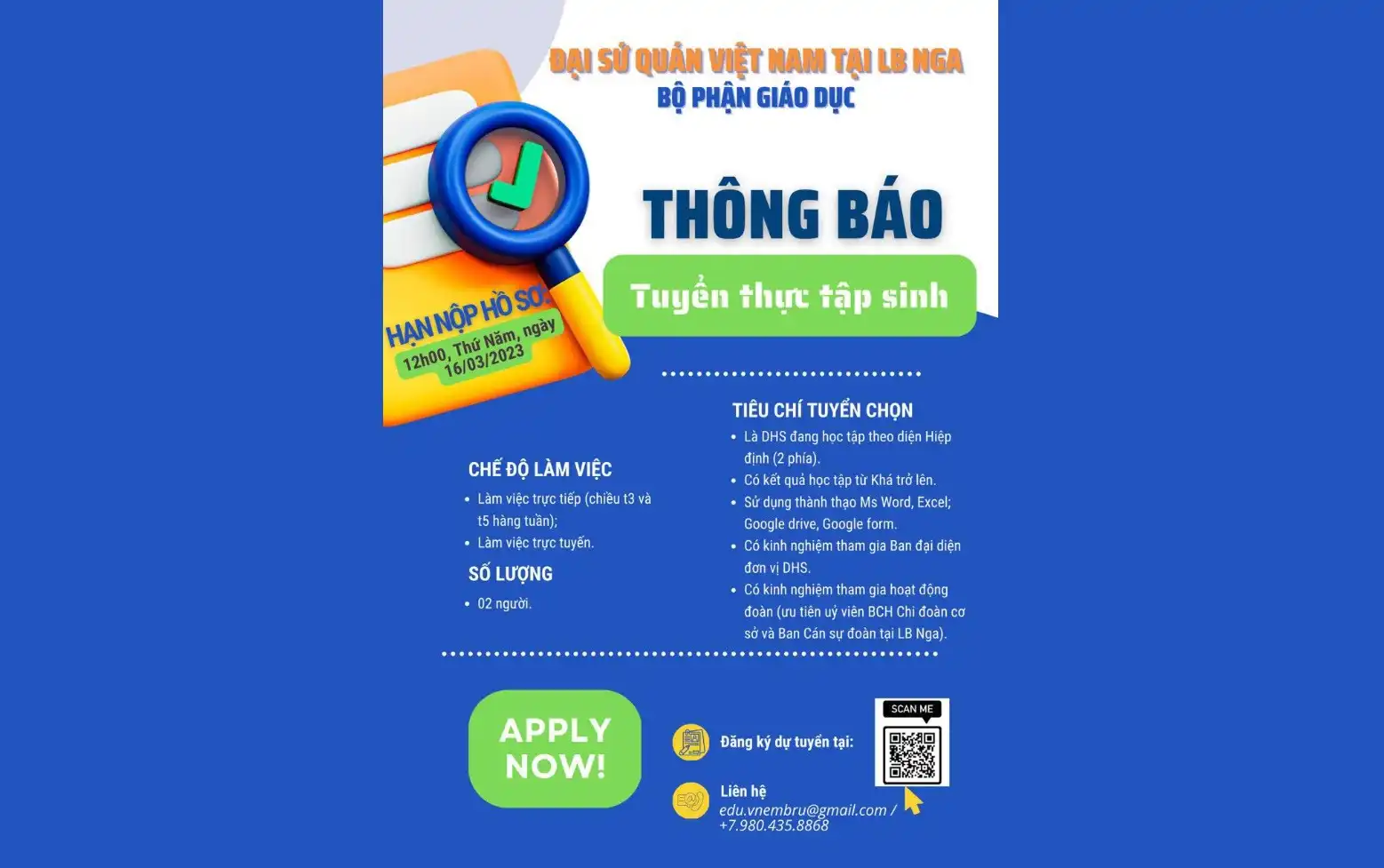 Bộ phận Giáo dục, Phòng KT-KH-GD thuộc Đại sứ quán Việt nam tại Liên bang Nga tuyển chọn thực tập sinh. Đây là cơ hội tốt giúp sinh viên tích luỹ thêm kinh nghiệm cho nghề nghiệp sau này dù ở bất kỳ ngành học nào cũng như phát huy tính tự chủ, sáng tạo của mỗi sinh viên. Chính vì vậy, Ban cán sự tại Liên bang Nga khuyến khích các bạn đoàn viên thanh niên đang sinh sống và học tập tại Nga tham gia thử sức thực tập tại môi trường tuyệt vời này.