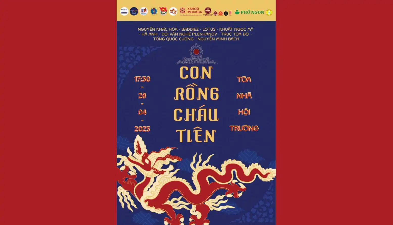 Hướng tới truyền thống tốt đẹp “Uống nước nhớ nguồn” của dân tộc Việt Nam ta, Hội Sinh viên Việt Nam tại MGIMO quyết định tổ chức đêm văn nghệ mang chủ đề “Con Rồng Cháu Tiên” – dựa theo truyền thuyết Lạc Long Quân và Âu Cơ. Đêm văn nghệ sẽ chia làm 2 phần:
