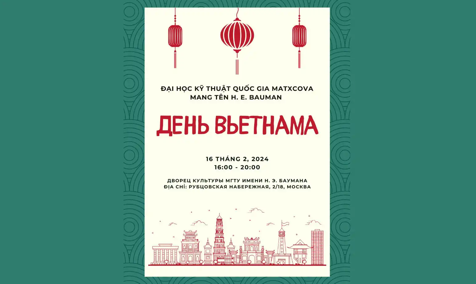 Trong không khí hân hoan đón chào năm mới Giáp Thìn 2024, Ban Tổ chức chương trình “День Вьетнама” xin gửi lời mời trân trọng đến toàn thể sinh viên đang học tập tại trường Đại học Kỹ thuật Quốc gia Matxcova mang tên Bauman và sinh viên đang học tập tại các trường Đại học khác ngoài Bauman đến với ngày hội của chúng mình! Chắc chắn bạn sẽ không muốn bỏ lỡ sự kiện ” День Вьетнама ” tại Đại học Kỹ thuật Quốc gia mang tên Bauman – một hành trình khám phá văn hóa Việt Nam đầy màu sắc và ấn tượng!