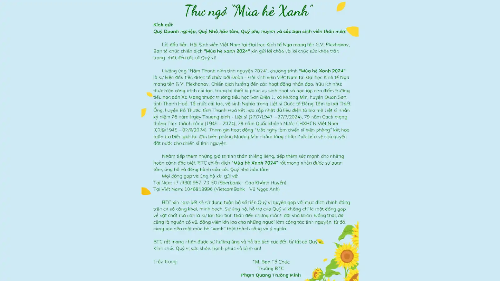 Để hoàn thành sứ mệnh đó, Đội tình nguyện Mùa hè xanh Plekhanov rất mong đợi sự giúp đỡ, đóng góp của các doanh nghiệp, cơ quan, tổ chức, cùng các nhà hảo tâm. Những đóng góp dù nhỏ của các bạn cũng sẽ góp phần không nhỏ trong việc đem đến niềm vui và niềm hạnh phúc cho những người dân vùng cao, cho những em nhỏ khó khăn.