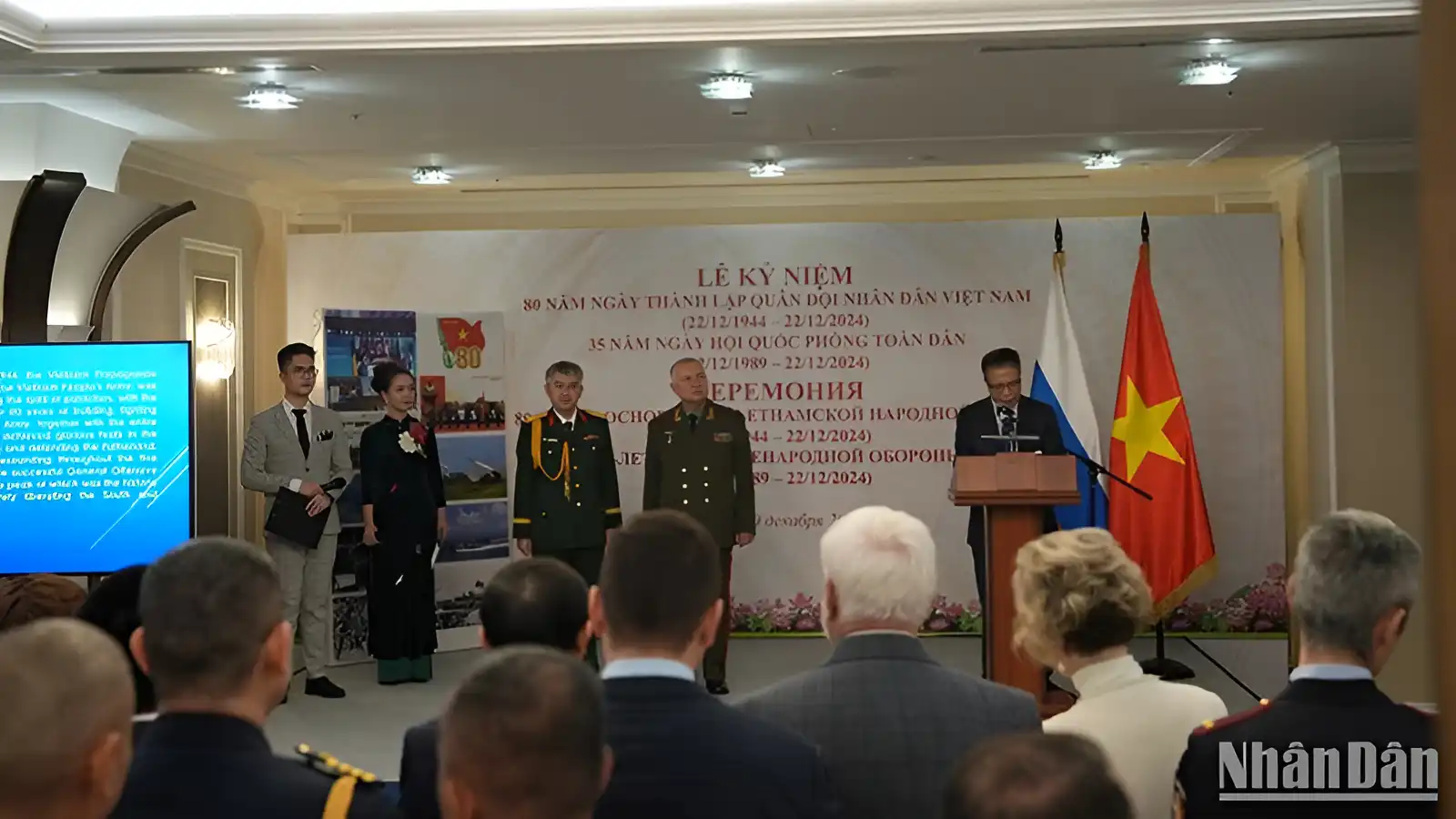 Tối 10/12, tại Moskva, Đại sứ quán Việt Nam và Cơ quan Tùy viên Quốc phòng Việt Nam tại Nga đã phối hợp tổ chức trang trọng lễ kỷ niệm 80 năm ngày thành lập Quân đội Nhân dân Việt Nam (22/12/1944-22/12/2024) và 35 năm Ngày Hội Quốc phòng toàn dân (22/12/1989-22/12/2024).