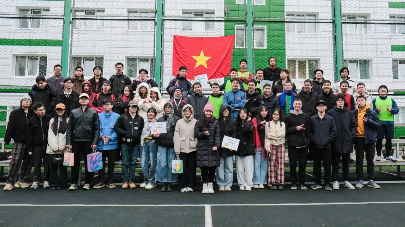 Ngày 11/5 vừa qua, sân vận động của Trường Đại học Tổng hợp Kỹ thuật Tomsk (TPU) đã chứng kiến một không khí vô cùng đặc biệt: rộn ràng, sôi động và đậm đà bản sắc Việt Nam. Dù thời tiết Tomsk vẫn còn lạnh buốt, với những cơn gió băng giá lướt qua từng khán đài, tinh thần thể thao và lòng nhiệt huyết của các bạn du học sinh Việt Nam đã làm “tan băng” cả bầu không khí, biến sân bóng thành một “chảo lửa” thực thụ.