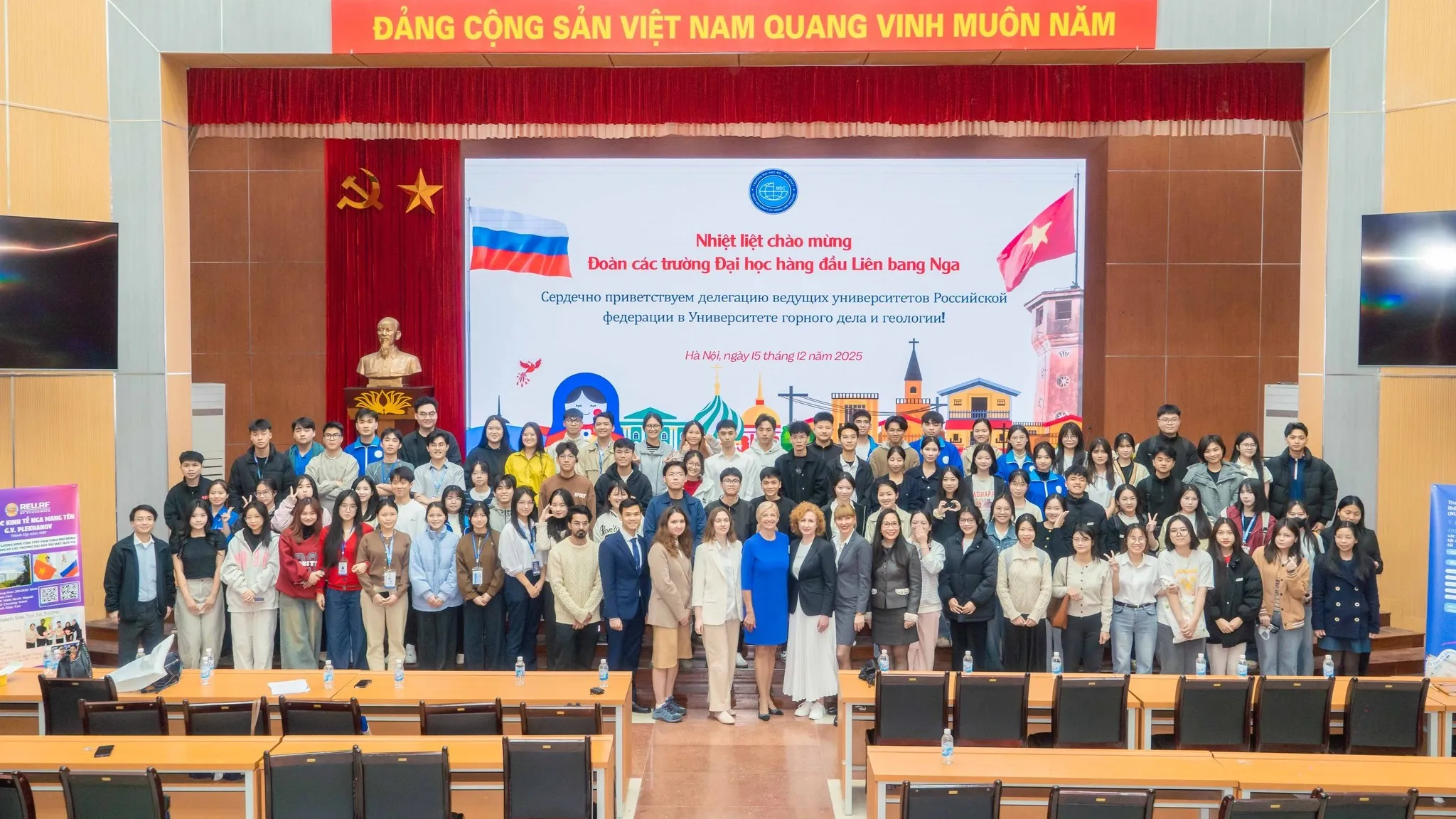 Chiều ngày 15/12/2025, tại Hội trường 300, Trường Đại học Mỏ – Địa chất (HUMG) đã phối hợp với Trung tâm Khoa học và Văn hóa Nga tại Hà Nội tổ chức chương trình “Giới thiệu về các chương trình giáo dục của các Trường Đại học Liên bang Nga”. Sự kiện thu hút sự quan tâm của đông đảo cán bộ, giảng viên và sinh viên, đồng thời diễn ra trong bối cảnh hoạt động giao lưu, hợp tác giáo dục giữa Việt Nam và Liên bang Nga đang được thúc đẩy mạnh mẽ theo hướng thực chất và chiều sâu.